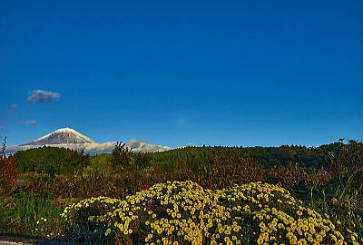 青い空に白い富士山で黄色の「菊」は一際目立ちます。