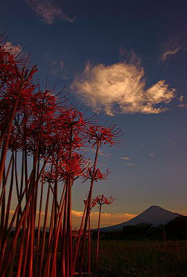 朝焼けに林立するヒガンバナです。 雲が少しだけ色付いてくれました。