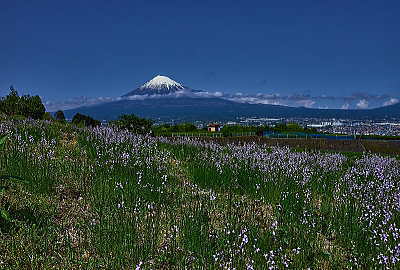 富士山に掛かる雲も良い感じです。 紅い花はツツジです。
