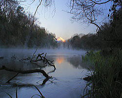水温は一年中一定温度です。外気温度が冷え込んだため見事な霞が漂う。