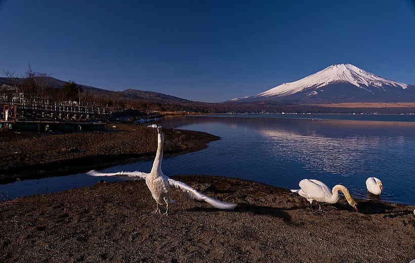 遠くの方で2匹の白鳥がじゃれ合っていました。 手前ではやきもちを焼いているのかもね。