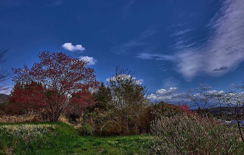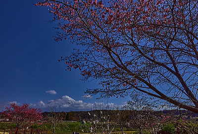 帰り道に「花園の丘カ」に寄ると大木の「ハクモクレン」の白花は黒くなって終り、「緋寒桜」の紅花が目立ちました。