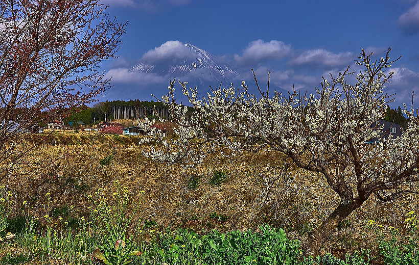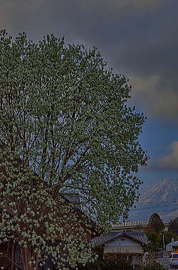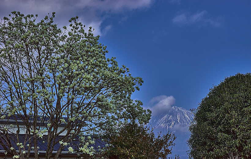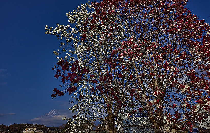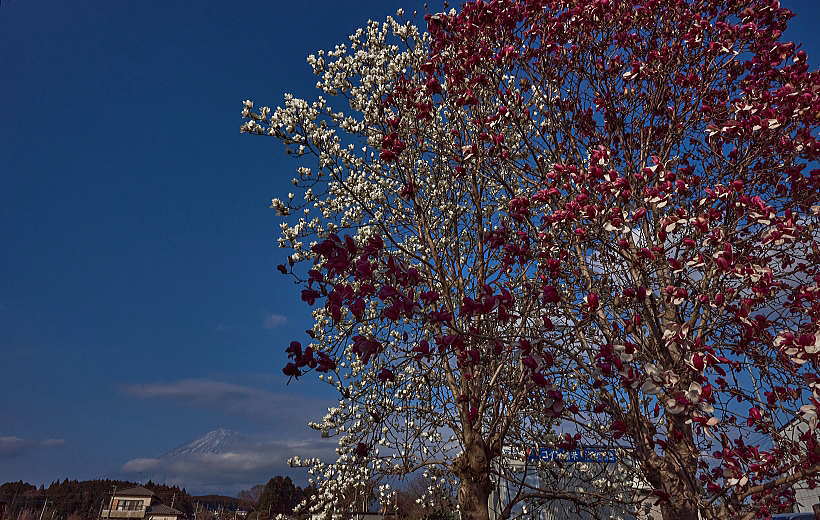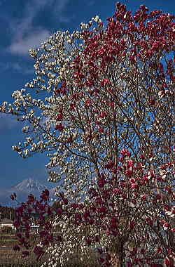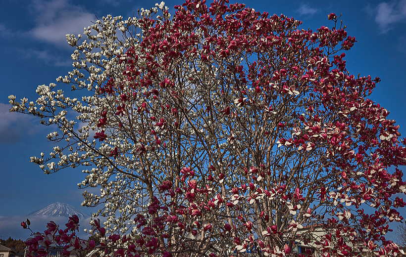 「紫のモクレン」と「ハクモクレン」に富士山とは贅沢です。