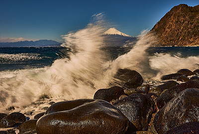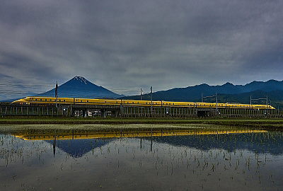 2月 怒涛寄せる春の海です。<<波>> 5月 田植えの終わった田んぼを駆け抜けます。<<ドクター・イエローR>>