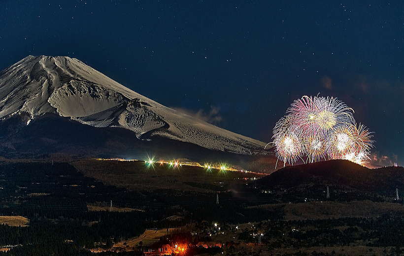 12月 「ぐりんぱ」の花火です。5000発でキレイでしたよ。月夜で富士山もバッチリでした。