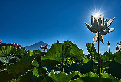 8月 蓮の花にお日ちゃまを乗せてみました。<<蓮の花>> ダイヤは不発、雲が多く彩雲となりました。<<ダイヤA>>