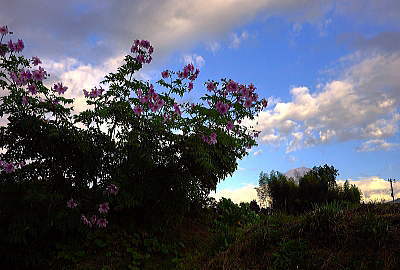 うろこ雲に薄紫の花が映えます。