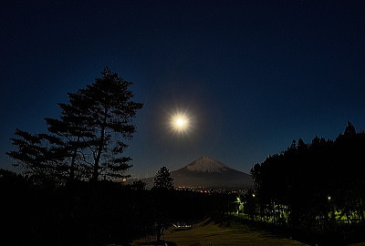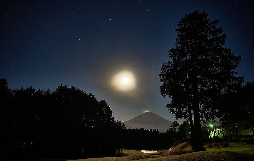 広々としたゴルフ場の端っこの道路での撮影です。おっ月さんが山頂に乗っかった時点で太陽光度-1.7度 月齢15.5に挑戦です。