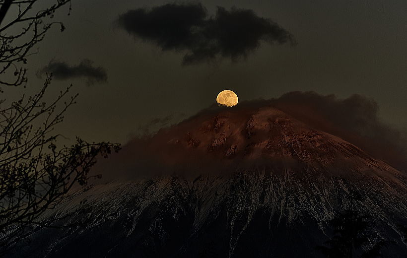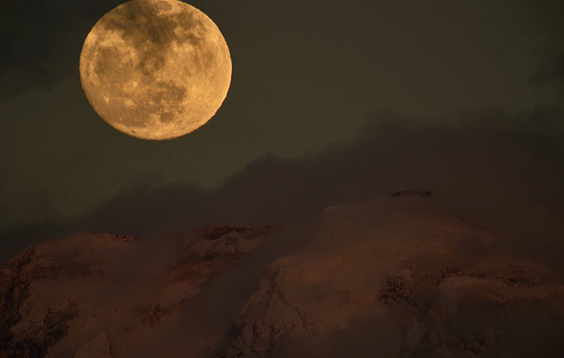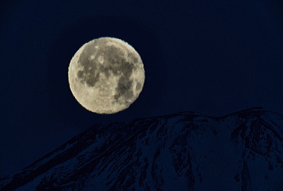 南端の剣が峰の上に乗っかりました。薄雲が掛かっているためおっ月さんが微妙に歪んで見えます。