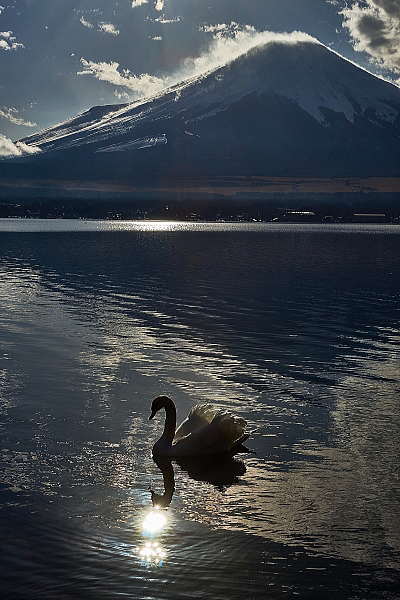 ダイヤモンド富士の完成です。ダブルになるべきお日さまの代わりに白鳥で〜す。