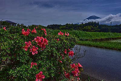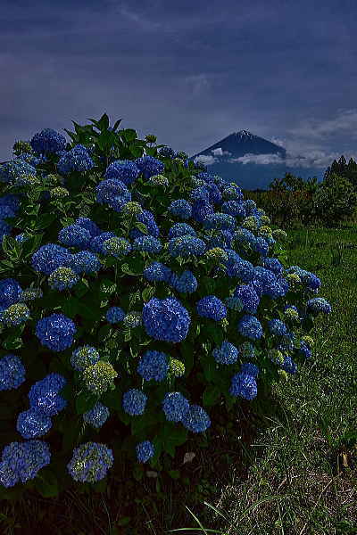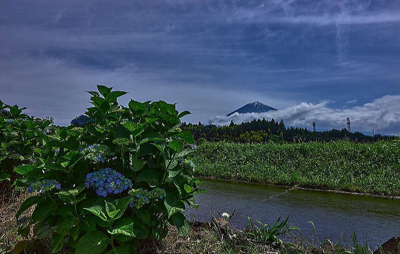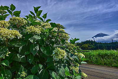 「アジサイ」は水が良く似合う。川みたいになっているけれど道路。田んぼから溢れてる。