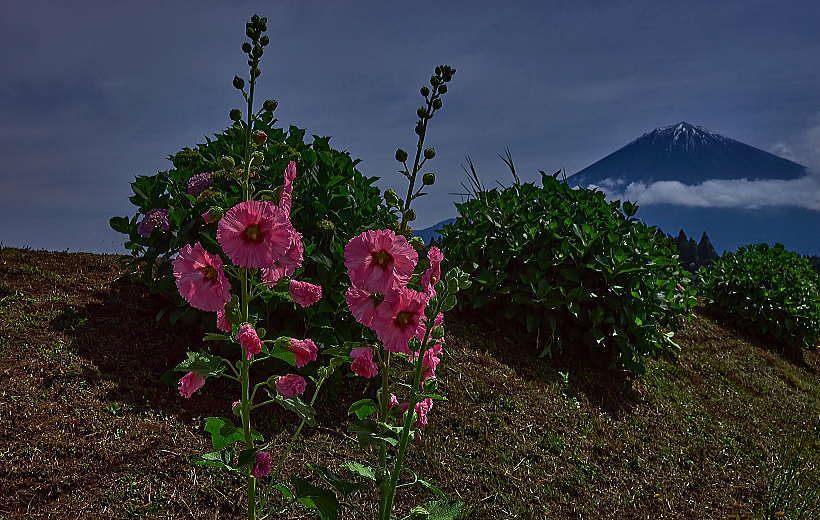 「タチアオイ」って随分大きい花でびっくり。田んぼに逆さが上手く映ってる。