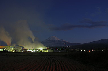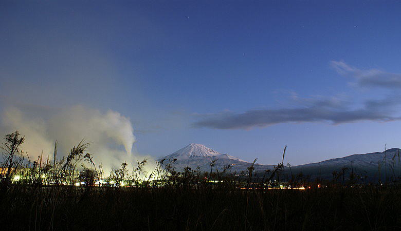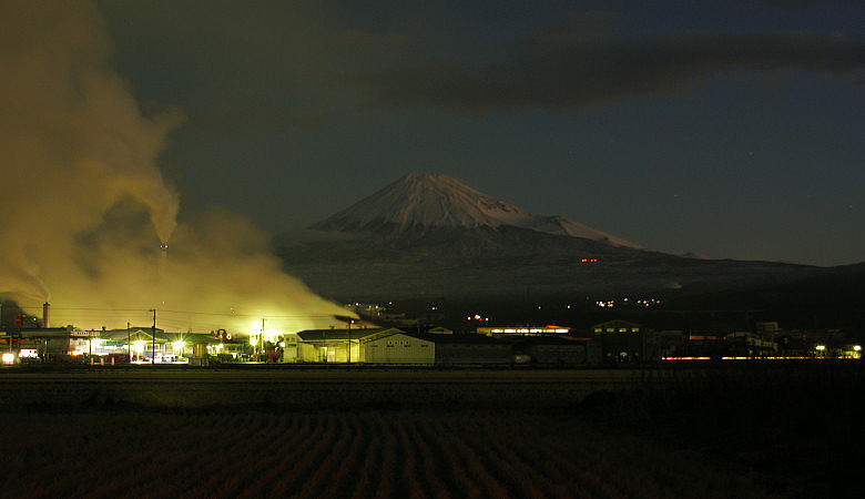 当初、真っ白な富士山をバックに工場の排煙を撮ってみました。