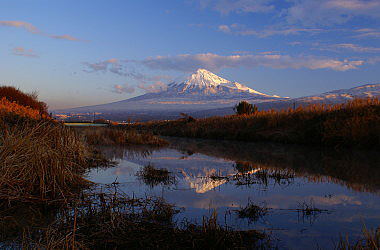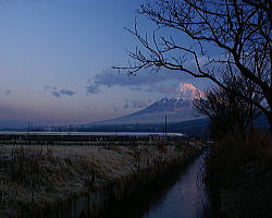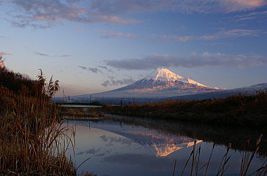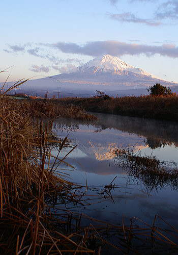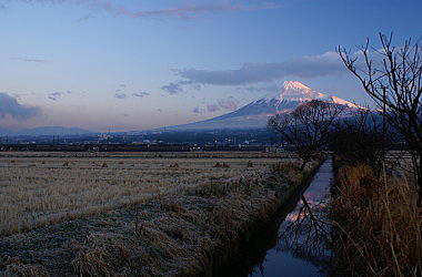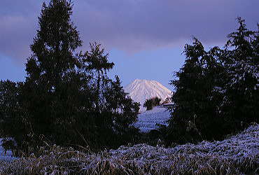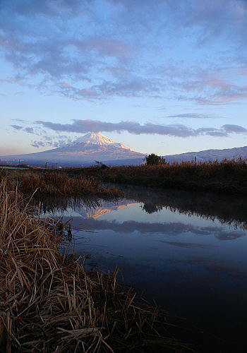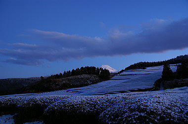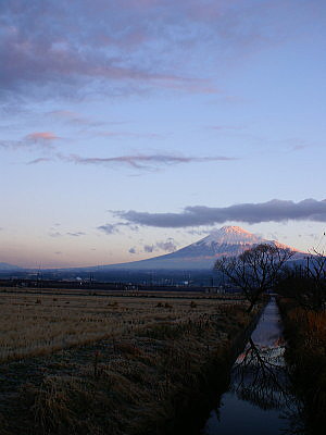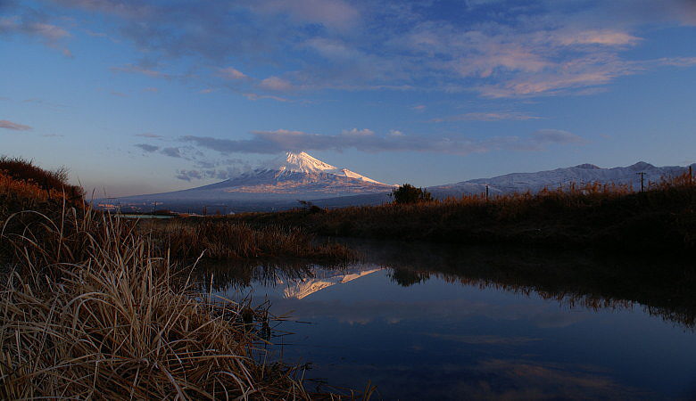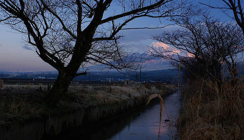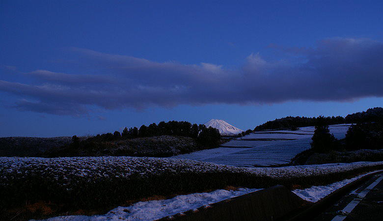 僅かに残る星も、まもなく消えていきます。昨日降った雪が、右側愛鷹山をも浮き立てます。