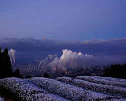 眠らない産業の街富士市、モクモクと煙を吹上げる工場、彼方には富士の山。